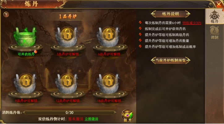 每次炼制丹药需要消耗一定时间(可消耗钻石加速),随丹炉品级提升最高可开启6个丹炉同时炼制。