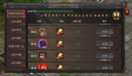 2、「金秋宝库」消耗庆典券,全服兑换指定道具,全服限量;