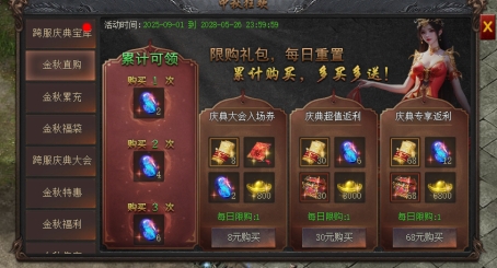 6、「金秋特惠」消耗元宝购买金秋福利礼盒,获取游戏资源;