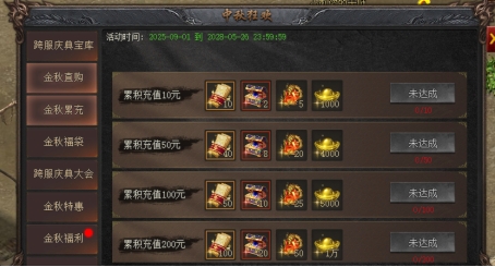 9、「金秋累充」真实累充送抽奖次数,返庆典券+绝版幻武、幻甲、称号+养成材料。